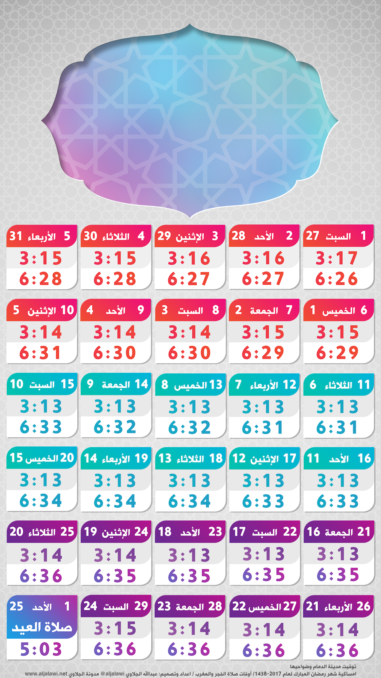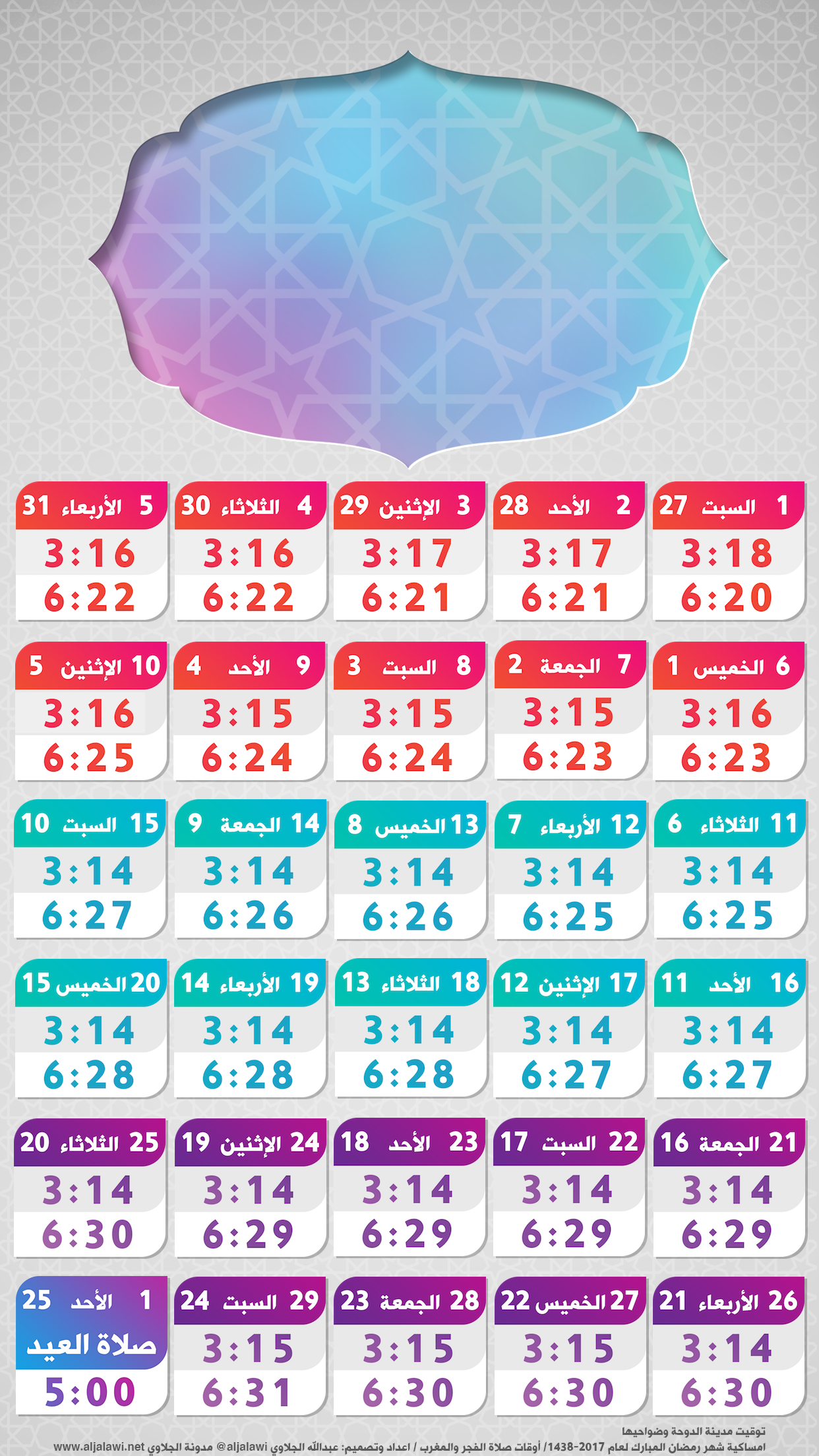 كما جرت العادة السنوية منذ 2014 أقدم لكم إمساكية مدونة الجلاوي لشهر رمضان المبارك حسب توقيت: