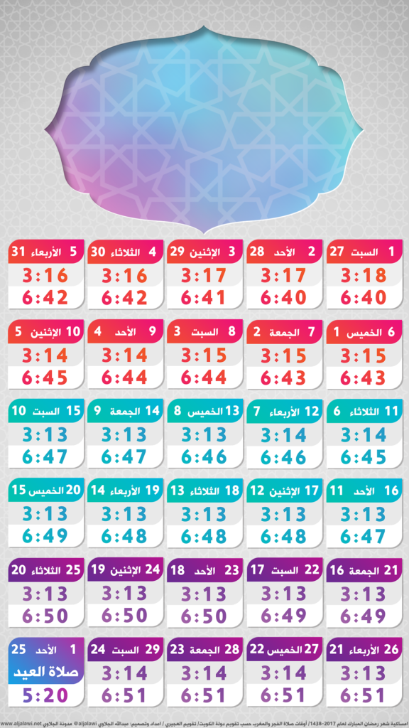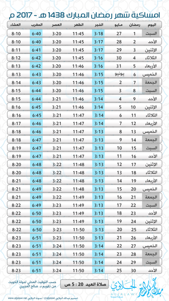 الامساكية بتوقيت دولة الكويت حسب تقويم د. صالح العجيري حفظه الله